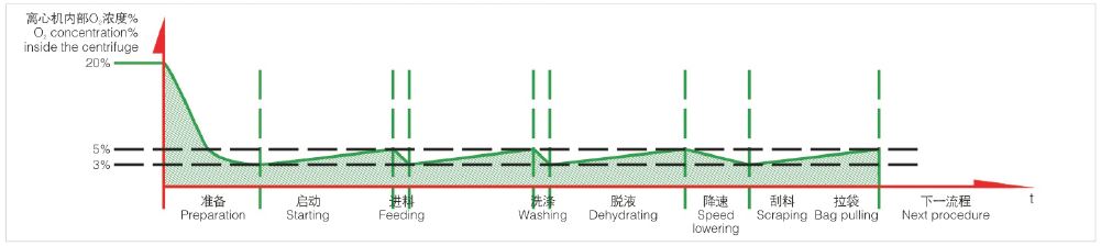 防爆型拉袋离心机采用防爆标准制作,在离心机主机开启前进行大流量氮气置换。通过氧气含量检测、压力检测等途径确保离心机机内气体惰性化,满足离心机运行要求。设备运行后,动态监测氧气含量,进行大流量氮气置换或小流量低压氮气补充,确保设备的隔爆运行要求。